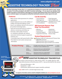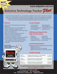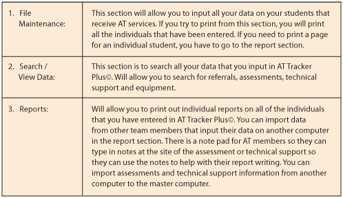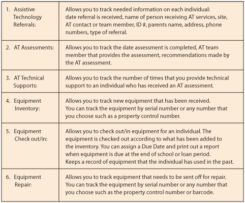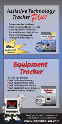The Equipment Tracker© is an easy-to-use database that enables any agency (school district, state agency, or private organization) to keep track of all equipment owned and utilized by the agency. It has a built-in "check out/check in" system and records all equipment repairs and/or maintenance.